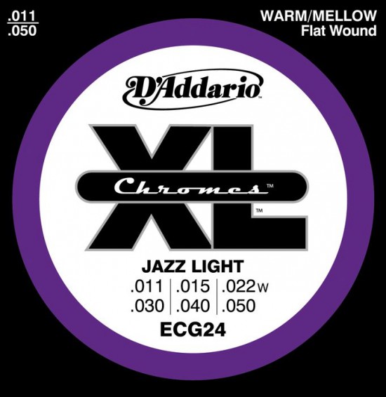 Cтруны для электрогитары D'Addario ECG24 XL Chromes Jazz Light Flatwound 11-50 с плоской обмоткой, 3-я струна в оплетке. Материал: хром, размеры струн: 11-15-22-30-40-50.