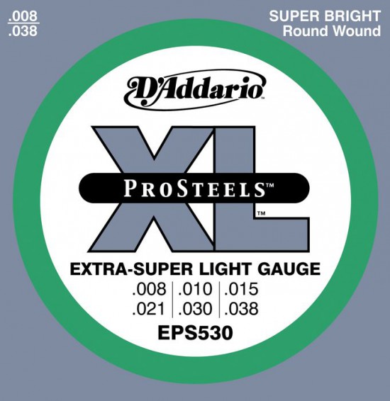 Струны для электрогитары D'Addario EPS530 ProSteels Extra Super Light 8-38 с круглой стальной обмоткой. Размеры струн: 8-10-15-21-30-38.