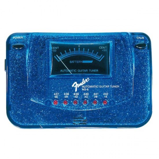 Fender AG6 тюнер. Для электро, акустической гитары, и бас, AG-6 особенности: зажженная VU meter для быстрой и точной настройки на темной сцене. Шесть Светодиодов, чтоб вы точно знали, какие струны вы настраиваете. Включает микрофон, индикатор аккумулятора, 9 вольтовый сетевой адаптер разъем и вход/выход разъемы для удобства в режиме онлайн. Яркие голубые искорки, пластиковый корпус.