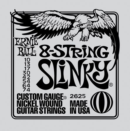 Ernie Ball 2625 8-String Slinky 10-74. Эти струны имеют высокое качество изготовления, благодаря высоким стандартам и жестким требованиям, что гарантирует их прочность, оптимальное эксплуатационные качества и долгий срок службы. Струны с обвивкой представляют собой гексагональный(шестигранный) стальной стержень с навитой на него проволокой из никелированной стали. Струны без обвивки изготовлены из стальной высокоуглеродистой проволоки закаленной специальным образом. Дают вашей гитаре хорошо сбалансированный тон. 10-13-17-30-42-54-64-74