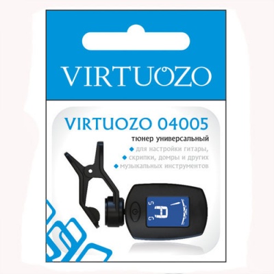 Virtuozo 04005 Тюнер хроматический для гитары, баса, смычковых и других инструментов, трехцветный дисплей,смена цвета в унисон, А430-450Гц, микрофон или пьезо, черный корпус, форма овальная трапеция, надёжная клип-прищепка, батарейка в комплекте.
