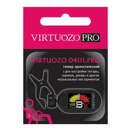 Virtuozo 0411.PRO. Тюнер хроматический для гитары, баса, смычковых и других инструментов, многоцветный дисплей, смена цвета в унисон, чёрный корпус, форма овал, калибровка Ля-А-430-450Гц, батарейка в комплекте.