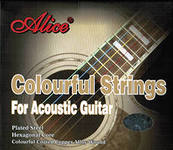 Alice AW435C. Комплект цветных струн для акустической гитары, Основа басовых струн - высокоуглеродистая немецкая стальная проволока имеющая шестигранное сечение, обмотка - цветная бронза. Диаметры (дюйм/мм): .011 .015 .024 .032 .042 .052 Упаковка - картонная коробочка.