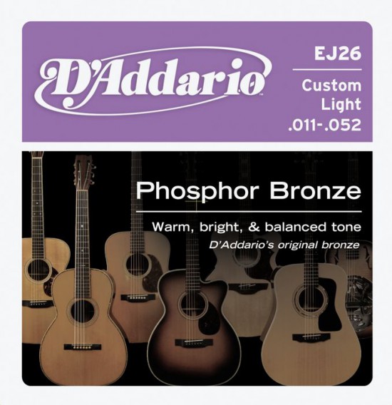 Струны для акустической гитары D'Addario EJ26 Phosphor Bronze Custom Light 11-52 из фосфорной бронзы с круглой обмоткой. размер струн: 11-15-22-32-42-52.